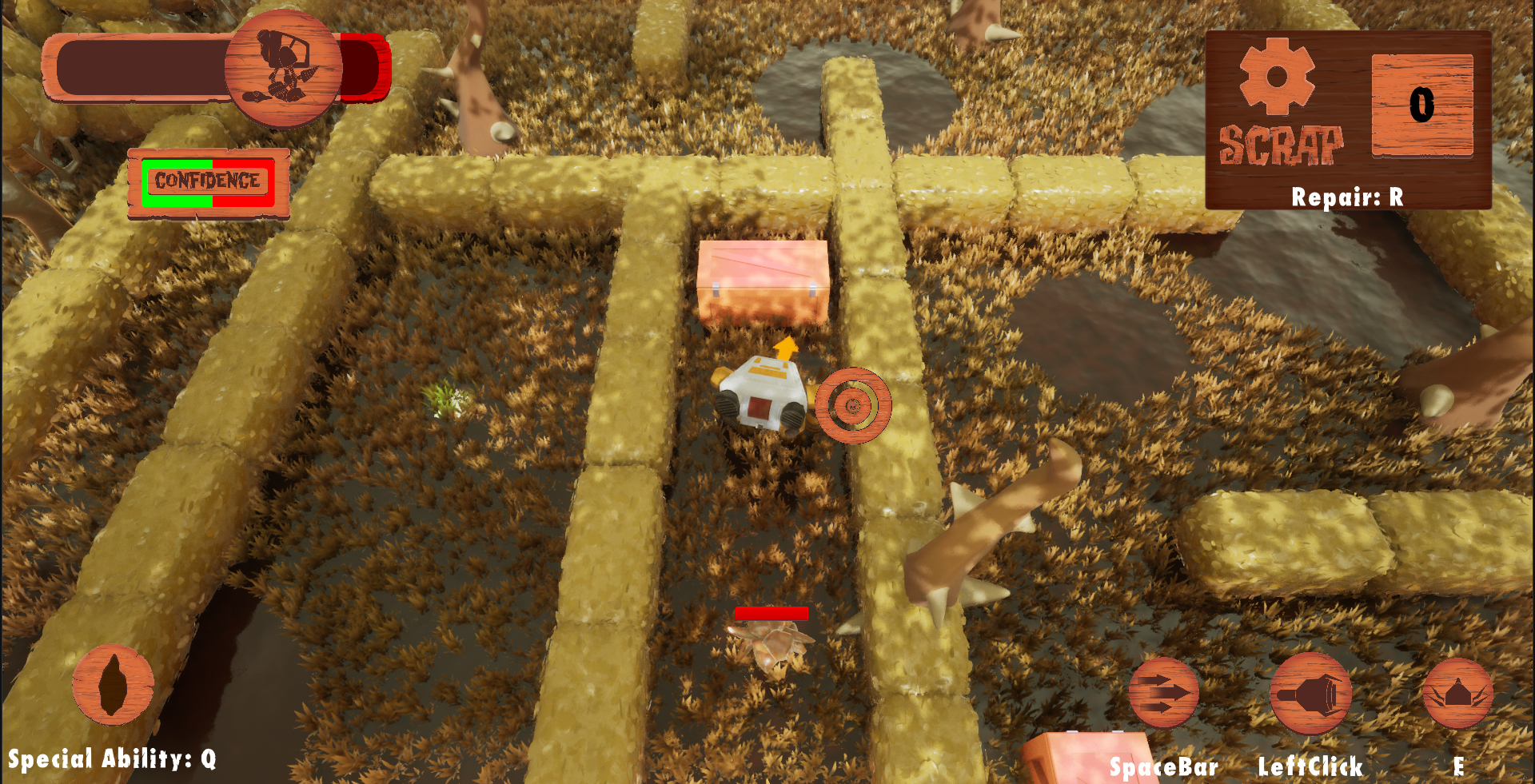 Our Game Demo is a dungeon crawler roguelike that tells the story of a brilliant little girl who builds a mech vehicle to save her family’s farm from vicious creatures who aim to steal the valuables of their land, all while struggling with deep self-doubt.